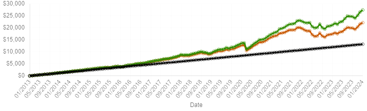 ผมขอยกตัวอย่างการ DCA ใน S&P500 เดือนละ 100$ เป็นเวลา 10 ปี (2014-2024)